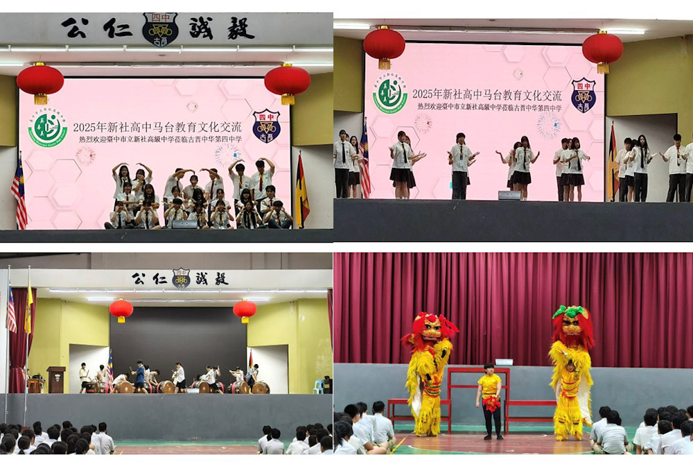 早上新社高中教育访问团一抵达四中,便受到四中全体师生的热烈欢迎。欢迎仪式上,双方师长亲切致词,表达两校情谊的珍贵与合作愿景。新社师生也带来精心准备的表演,展现台湾青少年的多元才艺;四中学生则呈现得奖作品二十四节令鼓与北狮文化演出,在锣鼓声与狮舞间,展现南洋文化的蓬勃生命力,场面热烈感人。新社高中学生也为四中师生准备他们的表演。