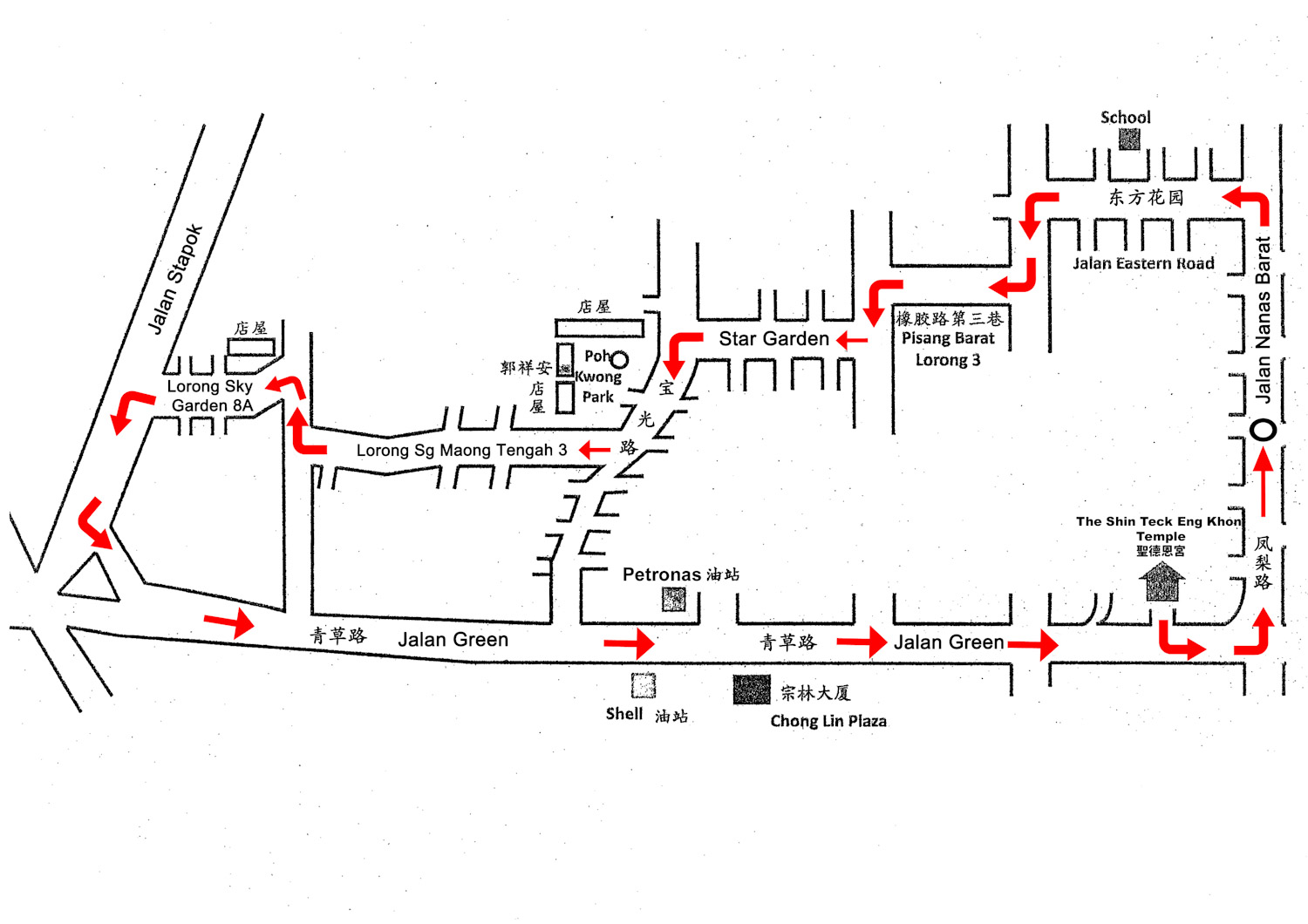 (5)巡游路线,即从青草路庙宇出发、途经凤梨路(至联冠超市)、转入东方花园、香蕉路第三巷、Star Garden(星园)、宝光村路(八角亭)、宝光村路第三巷、Sky Garden(云天花园)第八巷A、史打博路(现称Lorong Sungai Maong Baharu)、转回青草路入宫。