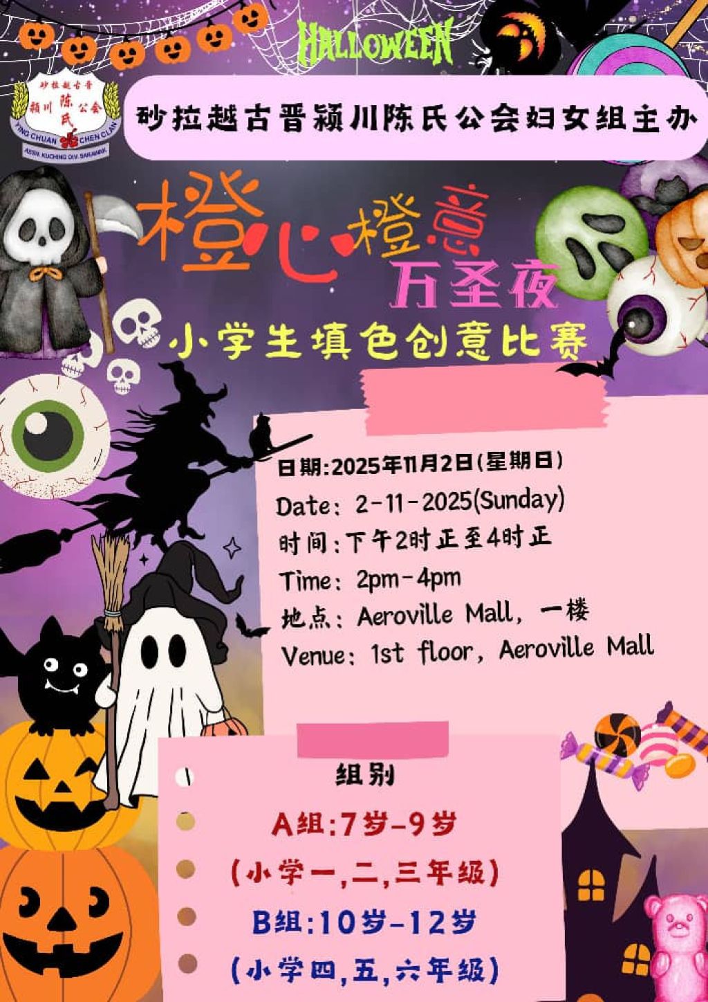 (古晋6日讯)砂拉越古晋颍川陈氏公会妇女组订于11月2日(星期日)下午2时正至4时正在实都东巴鲁路的Aeroville Mall―楼举办"橙心橙意 万圣夜"小学生填色创意比赛。