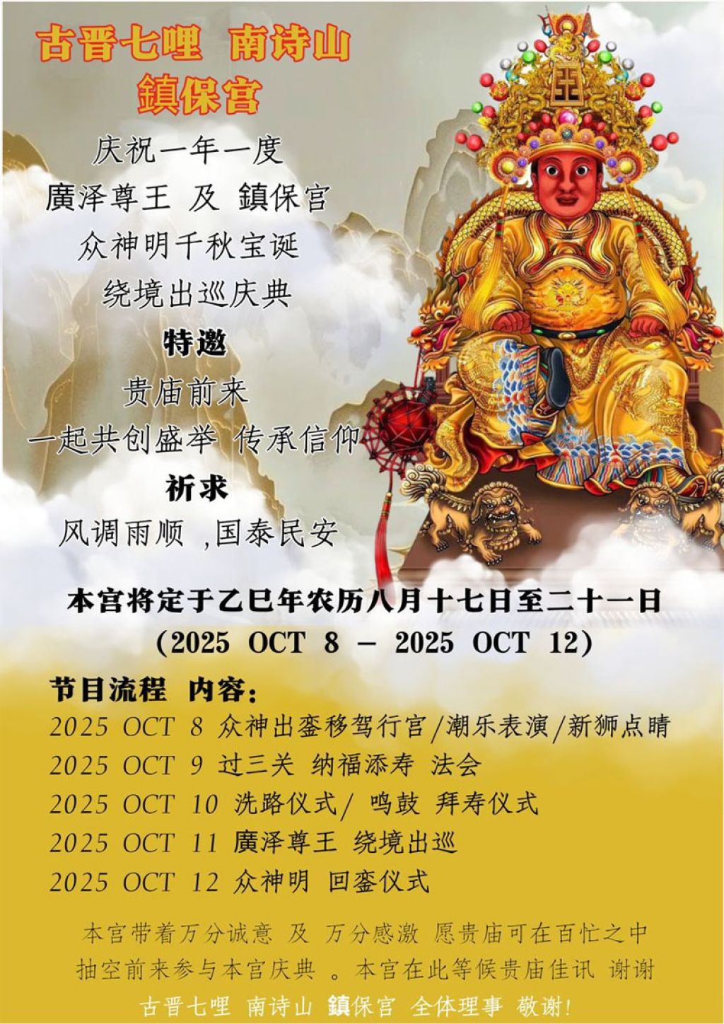 镇保宫从10月8日起展开系列活动,其中10月8日(星期三)为众神出銮移驾行宫、潮乐表演及新狮点睛;10月9日(星期四)过三关、纳福添寿及法会;10月10日进行洗路仪式、鸣鼓及拜寿仪式;10月11日举行出游庆典;10月12日则是神明回銮仪式。