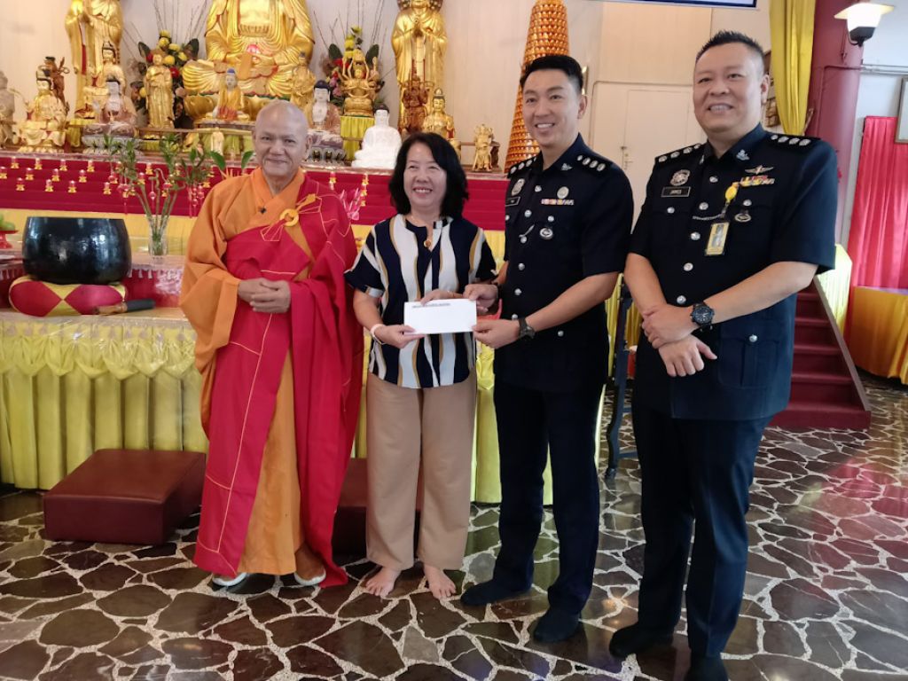 (古晋2日讯)砂拉越佛教会今日在该会大雄宝殿举办警察日祈福法会,结合宗教仪式与社区关怀活动,为警员及社会大众祈愿平安,同时提升防诈骗意识,吸引警方代表、家属及幼儿园学生等约100人参与。