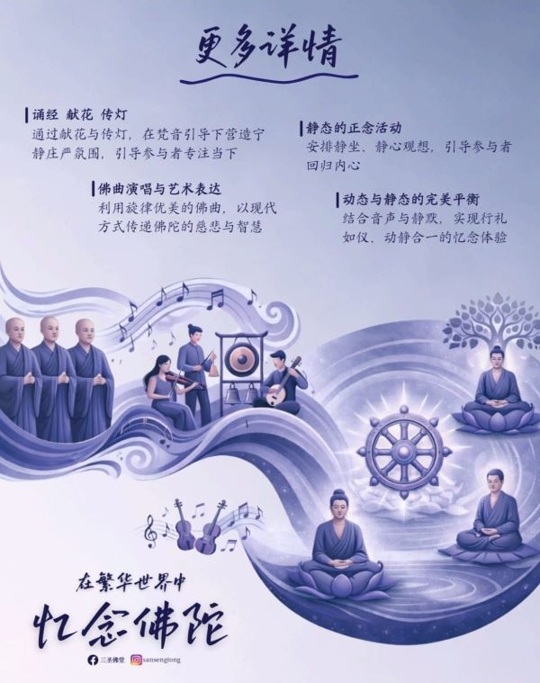 此次忆念佛陀日以"在繁华世界中忆念佛陀"为主题,融合文化教育与宗教仪式,通过献花、传灯、佛曲及手语表演等形式呈现。本次活动报名费采取随喜乐捐方式,不设固定金额。