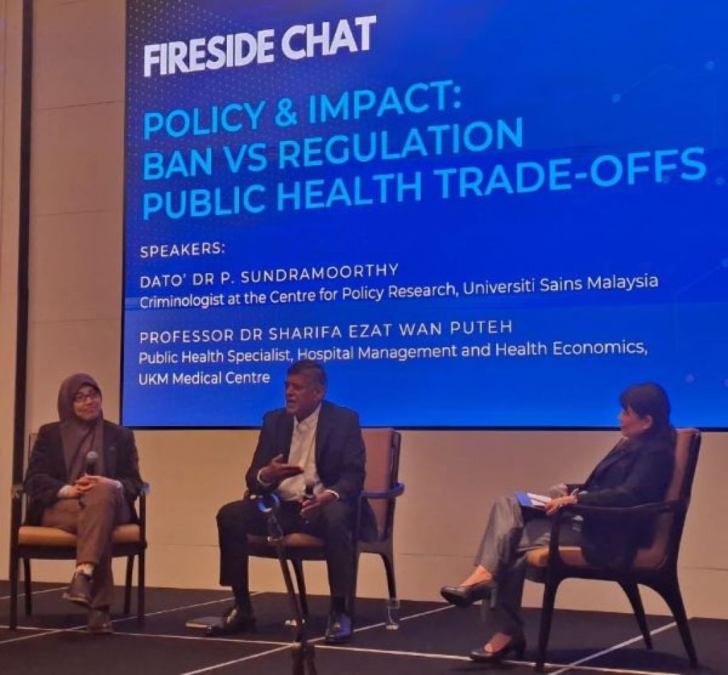 禁令与监管:公共卫生取舍”对话环节上,主持人Dayak Daily董事钟连叶(右)与主讲嘉宾——马来西亚理科大学政策研究中心犯罪学家拿督孙德拉慕迪(中)及国立大学医疗中心公共卫生专家莎丽花依扎特(左)同台交流,围绕减害与全面禁令的取舍、青少年保护,以及公共卫生与执法层面的影响展开讨论。