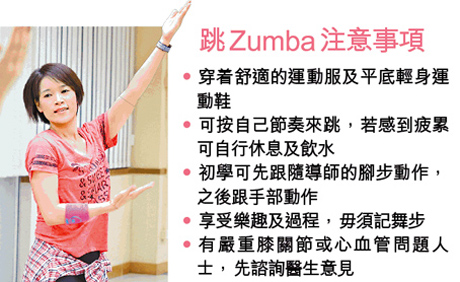 Have Fun(拥抱欢乐)、Enjoy Music(享受音乐)是跳Zumba健体舞的精髓。健体教练表示,Zumba是一种融合多种拉丁舞蹈及健身动作的中等强度带氧运动,可锻炼心肺功能、烧脂、强化肌肉及收紧线条。由于不用牢记舞步,只需跟随导师及轻快的音乐跳舞,有助都市人减压。