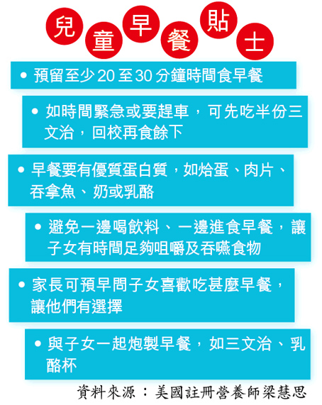 早餐谷物蕴含多种维他命及矿物质,可加入鲜奶或原味乳酪食用。梁指家长可选择包装上标签列出含铁质的款式,以及含有果仁、提子乾的早餐谷物,增加口感。家长时常转换早餐的水果款式,可提升子女吃早餐的意欲及胃口。