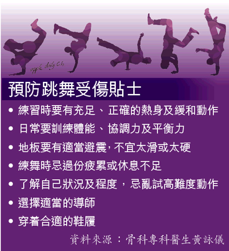 香港中文大学医务中心骨科专科医生黄咏仪表示,跳舞受伤属其中一种运动受伤,外国研究显示,成人跳舞受伤的风险介乎42%至97%。Break dance、Hip Hop较多涉及手撑地的动作,或要支撑另一拍档体重等动作的舞蹈,相对会较多上肢受伤。