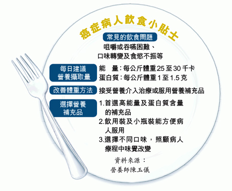此外,英国注册营养师陈玉仪表示,如果癌症病人出现营养不良及体重下降,会拖长治疗过程及住院时间,甚至会影响病人的治疗过程和疗效,亦有研究发现近两成癌症病人因营养不良而死亡,是其中一个主要的致死原因。她提醒,维持体重是癌症病人抗癌疗程的关键,如果医生发现病人体重大跌,化疗有可能因此被迫中断。