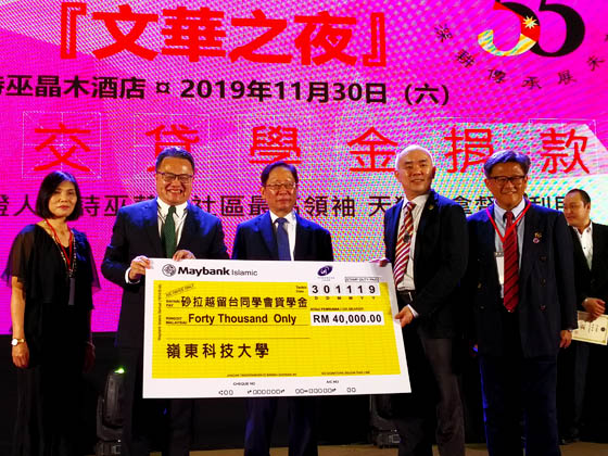 台湾岭东科技大学校长赵志扬移交4 万令吉模拟支票给砂留台同学会总会长陈章远,充作贷学金用途。