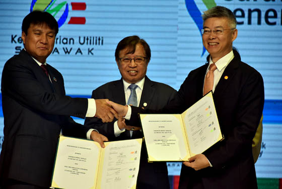 阿邦佐哈里(中)见证砂拉越能源公司与蚬壳公司交换合作备忘录。