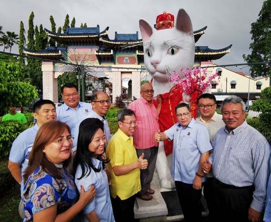 (古晋2日讯)古晋地标大白猫今日换上红彤彤新装迎春!