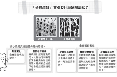 ●(b)图示:骨质疏松会造成易胖体质、容易疲累、无法抵抗疾病、加速老化、引发老人痴呆及所有生活习惯病等问题。