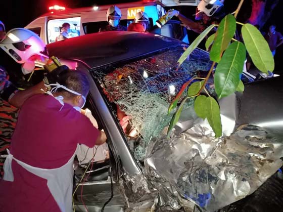 (诗巫22日讯)轿车超车时撞上停在逆向车道路旁的重型车,司机与前座乘客共赴黄泉!
