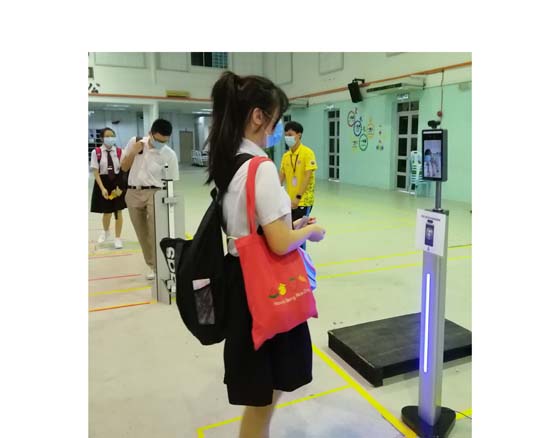 所有学生都安排在大礼堂进行体温测量,并设有两条走道,分别让高二与高三的学生轮候等待测量,并在测量前率先使用消毒液洗手。在测量后,学生也直接用他们的学生证直接透过电子扫描,并由负责老师协助记录学生的体温,后就步入所安排的课室。