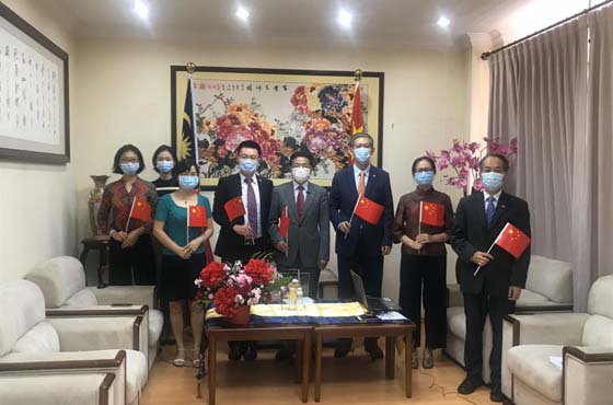 总领馆全体外交官手举五星红旗,齐声祝福伟大祖国繁荣富强,祝海外同胞阖家安康,祝中马友谊万古长青。