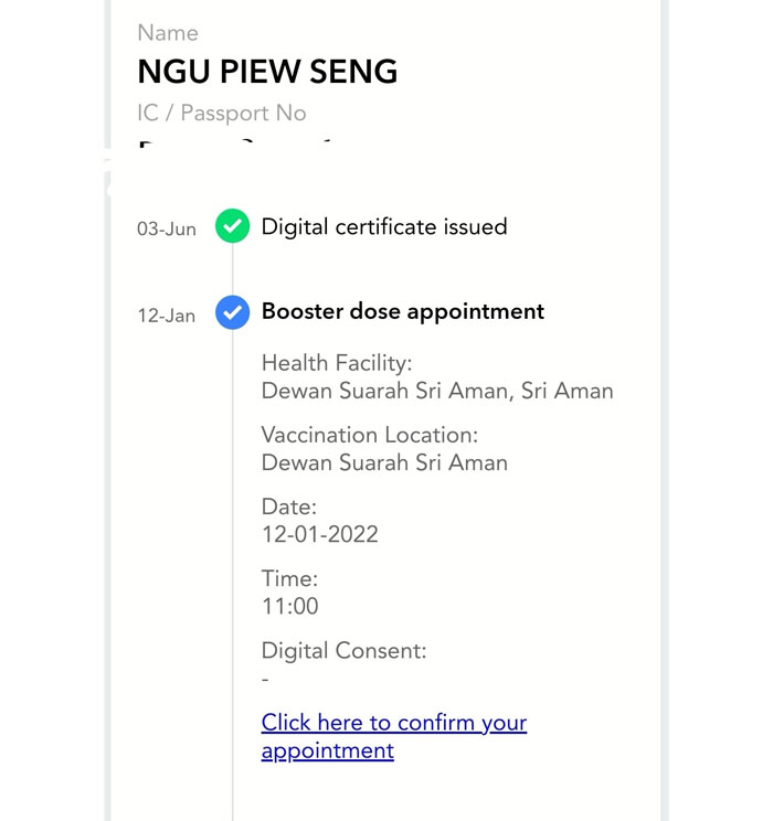 “於12月30日我就收到Protect Health公司的電郵表示我要回去為我施打加強針的診所以便更新施打加強針的資料。因此我就回去金寶林醫藥中心,該醫藥中心的負責人幫我再次提呈我施打加強針的資料重新發給Mysejahtera。”