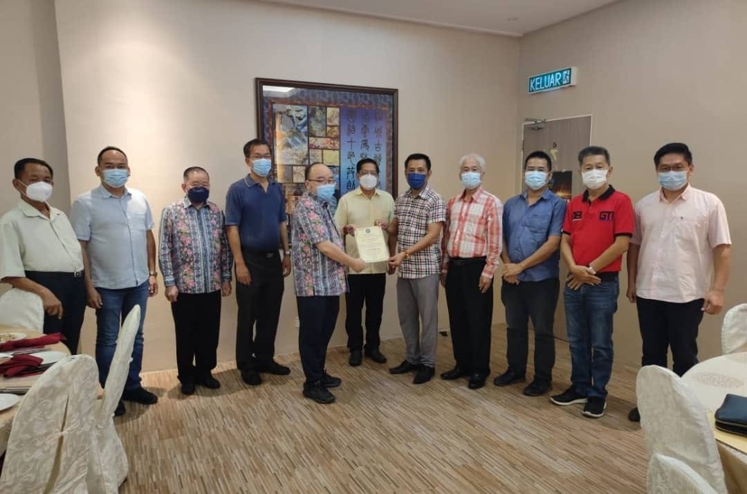 在古晋华人最高社区领袖天猛公拿督陈如飞(左六)及哥打圣淘沙区州议员叶耀星(左四)见证下,奔驰野狼爱心俱乐部主席蔡传伟(左七)颁发捐赠感谢状给予拿督斯里刘为强(左五)。左起为甲必丹陈奂荣、甲必丹拿督刘思乐及拿督龚财兴;右起为紫辉阁阁长蔡岷谷、奔驰野狼爱心俱乐部副主席黄理平、财政魏建成及秘书本固鲁田新华。