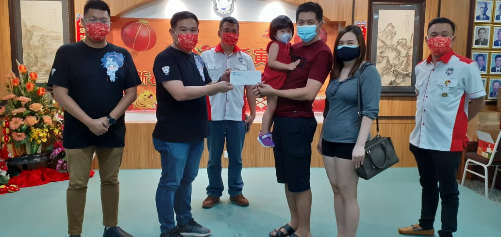 该会青年团团长黄伟忠和署理团长沈茂前今早在会长周文盛和福利股及墓山保管委员会主任陈实福的见证下,将《潮宝生育奖励金》下的奖励