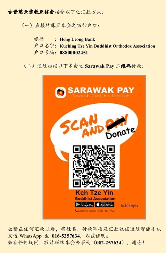 Hong Leong Bank:08800002451 Kuching Tze Yin Buddhist Orthodox Association。