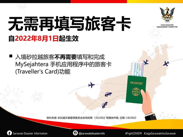 与此同时,砂灾难管理委员会按照卫生部宣布,从8月1日起,所有入境砂拉越的外籍人士无需在MySejahtera填写入境卡(Traveller’s Card)。