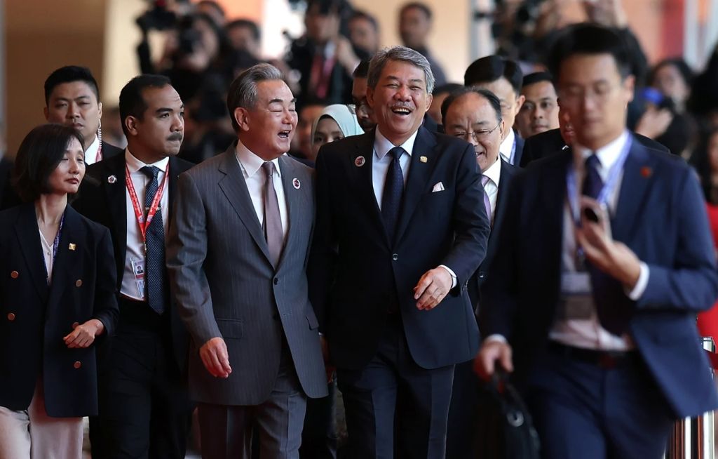 莫哈末哈山与王毅拍肩互相问候,并一同步入会场,以出席9时举行的东盟-中国部长级后续会议。中国外交部早前宣布,中国外交部长王毅将赴吉隆坡出席今日及明日举行的东盟-中国部长级后续会议、东盟与中日韩外长会议、东亚峰会外长会议及东盟地区论坛外长会议。