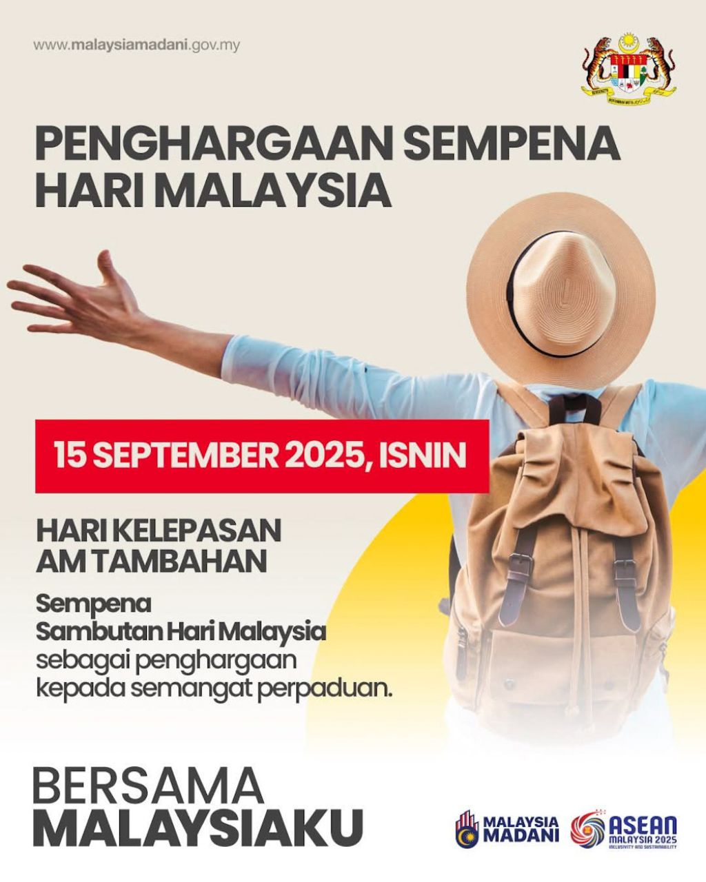 配合916大马日 915多放假一天 23 07, 2025 登载于 大马 (吉隆坡23日讯)首相拿督斯里安华宣布,配合今年9月16日的大马日,9月15日将被列为公假。 他说,这个公共假期是为了感谢团结的情谊,以及马来西亚成立的独特意义。 “同时也鼓励人民与乡村的家人联系感情,或在国内旅游度假,共度美好时光。” 更多相关: « 张庆信:首5个月迎来1694万旅客 中国游客增幅最高达38.8% RON 95 零售价每公升将下调至1令吉99仙 »