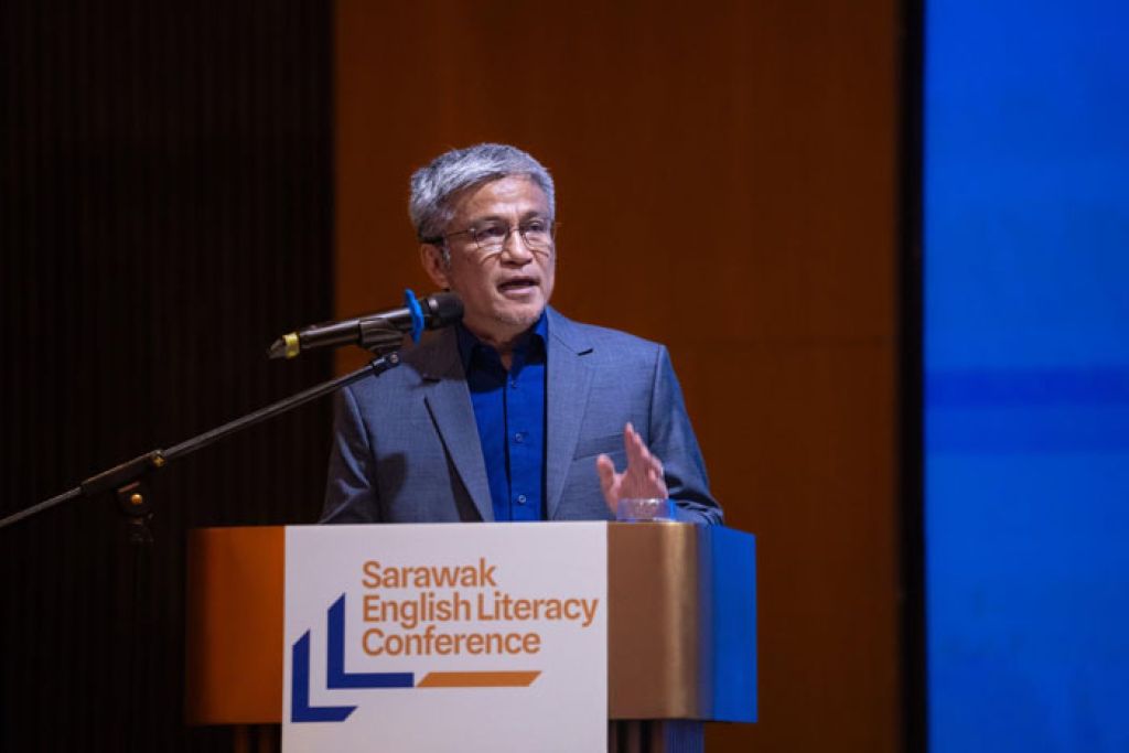 安华拉拜益周三代表砂总理拿督巴丁宜阿邦佐哈里主持2025年砂英语素养大会(SELC)开幕礼上,发表谈话说。