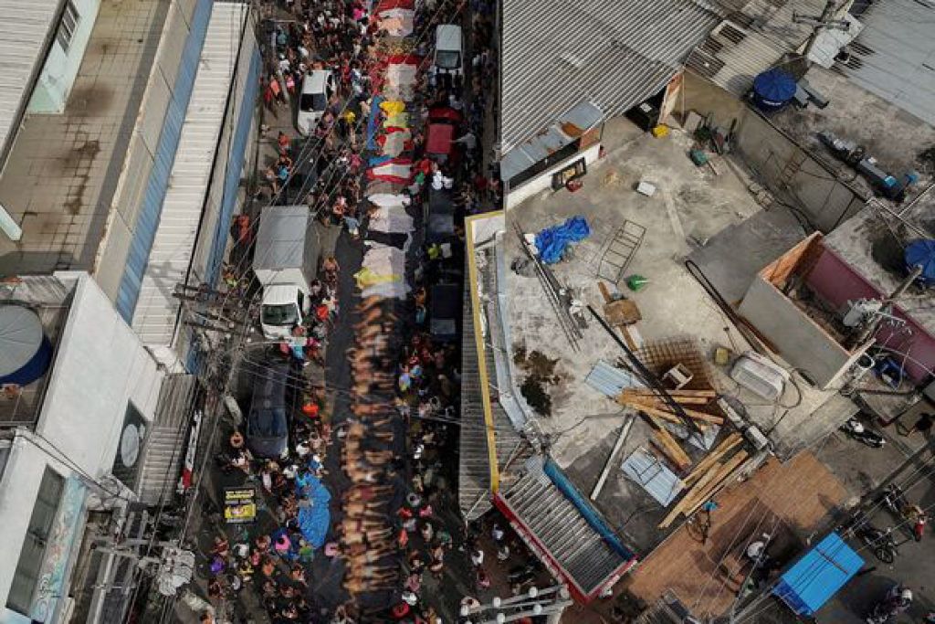 (综合10日电)巴西里约热内卢10月底的大规模扫毒行动造成至少121人丧命。路透社摄影师莫拉埃斯透过空拍镜头记录这场血腥反毒行动,只见街道变成临时停尸间,地上整排数十具尸体与周围车辆人群形成强烈对比,部分遗体以布覆盖,有的死者身上只有穿内裤。