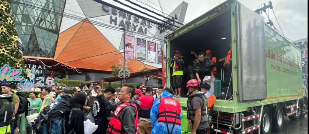 他说,他在前日(27日)从合艾叻帕差顺学校临时疏散中心脱困后,前往合艾Central商场向志愿消防队求助。