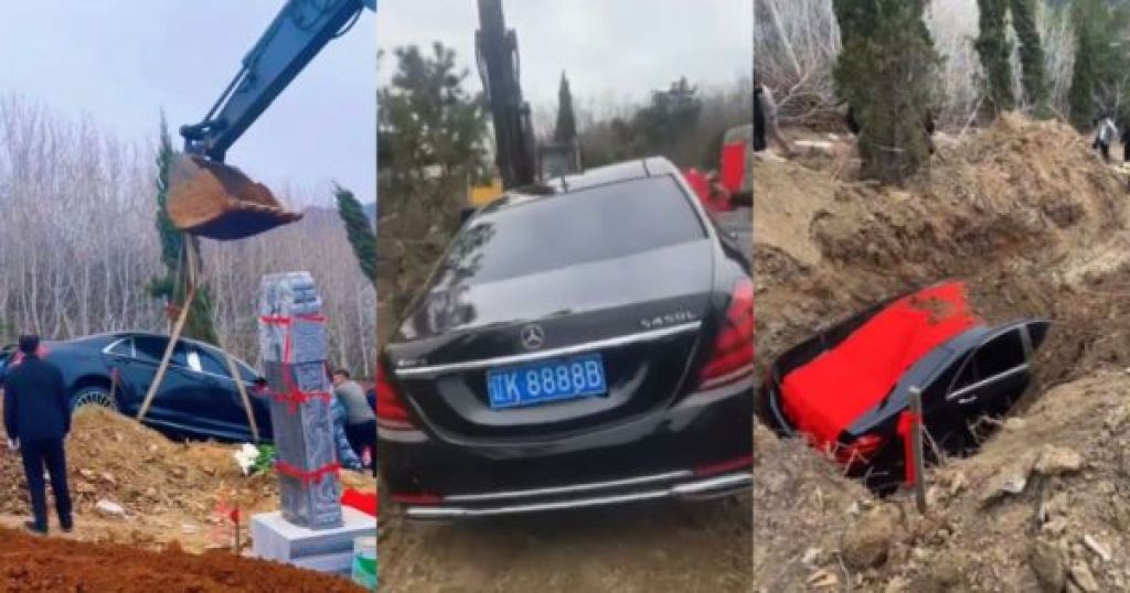 (综合10日电)中国辽宁一名富豪近日在办丧事时,将一辆市值约110万人民币起(约64万令吉)全新马赛地S450L轿车“活埋”,作为亲人的陪葬品,还配上“8888”车牌,被网民指是最牛陪葬。