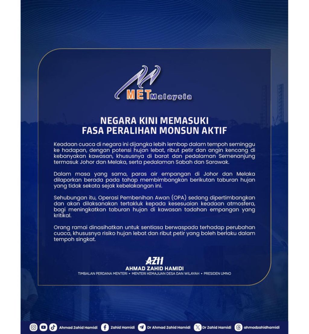 副首相兼国家天灾管理委员会主席的拿督斯里阿末扎希发文指出,天气变化虽有助于缓解近期的闷热天气,但一些地区尤其是北马和内陆地区气温仍偏高。