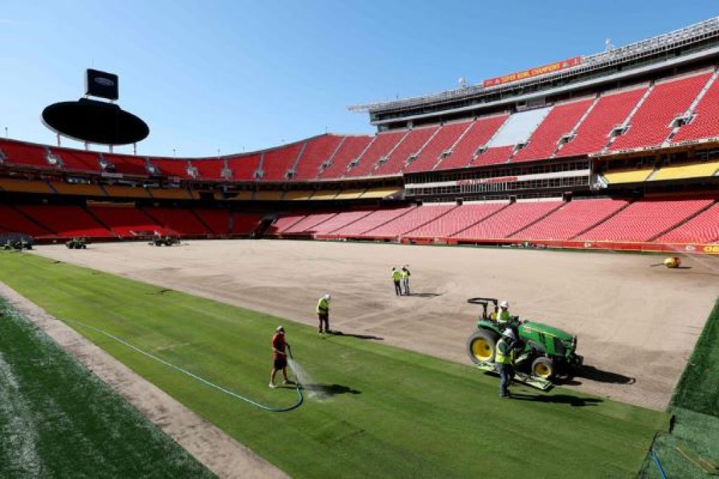 (综合24日电)一群工人在密苏里州堪萨斯城体育场为世界杯场地铺设草皮。