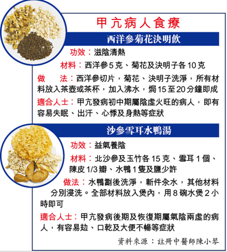 推介两个适合甲亢症病人的食疗,若在发病初中期属阴虚火旺的体质,例如容易失眠、出汗、心悸及身热等症状,可焗“西洋参菊花决明饮”饮用,有滋阴清热功效。病情属后期或恢复期,有气阴两虚情况的病人,即容易疲倦、口干及大便不畅,可煲有益气养阴功效的“沙参雪耳水鸭汤”饮用。