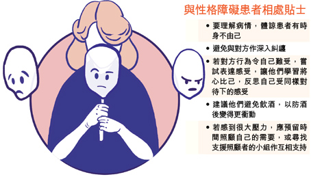 张称性格障碍有很多种类,很难一概而论,一般人与患者相处时,建议多体谅,毋须事事与对方纠缠。若对方行为令自己难受,尝试表达感受,让他们学习将心比己,反思自己受同样对待下的感受。身边人如感到很大压力,不妨找支援照顾者的小组帮忙,透过分享经验作支持,并要预留时间关注自己的需要。性格障碍长远也可诱发其他情绪问题如焦虑、抑郁、选择困难症等,需要正视,建议如疑似患者有情绪波动大或欠稳定,甚至有自残行为,最好劝喻他们寻求专业人士协助,例如辅导员、社工、心理学家或家庭医生等。