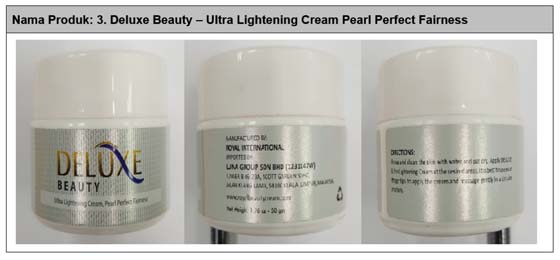 卫生总监丹斯里诺希山医生指出,这3款美容产品是Deeja Cosmetic Yulai Cream、DeejaCosmetic Laila Cream , 以及 Deluxe Beauty–Ultra Lightening Cream Pearl Perfect Fairness。