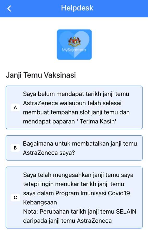 (吉隆坡5日讯)新冠疫苗供应特别委员会表示,MySejahtera应用程式已经更新“服务台”,提供新功能,民众可以通过此功能获得疫苗接种预约方面的帮助。