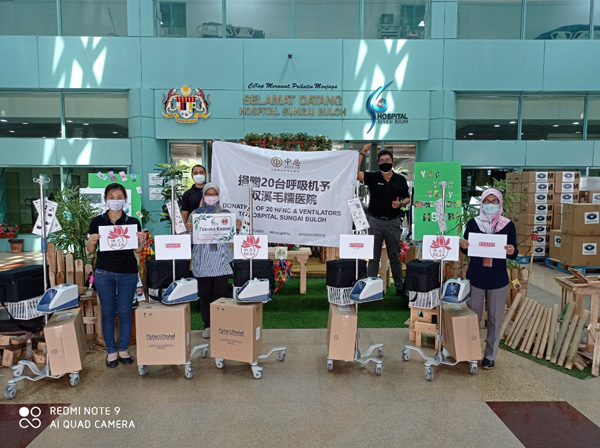 上个月杪,中总和数位领导,包括总会长丹斯里戴良业、丹斯里李贤、丹斯里林宽城及谢松坤博士甫捐赠了20台高流量鼻导管机(HFNC)予双溪毛糯医院及3台呼吸机予槟城卫生局,总值为62万6000令吉。中总去年捐赠的The Edge 冠病基金也在今年五月中旬移交33台呼吸机予双溪毛糯医院。