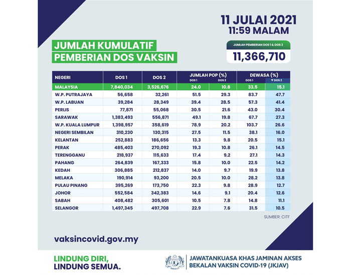(吉隆坡12日讯) 截至本月11日,全国已施打1136万6710剂新冠疫苗,其中784万0034人接种首剂疫苗,或占人口的24%;另352万6676或10.8%是完成次剂疫苗。