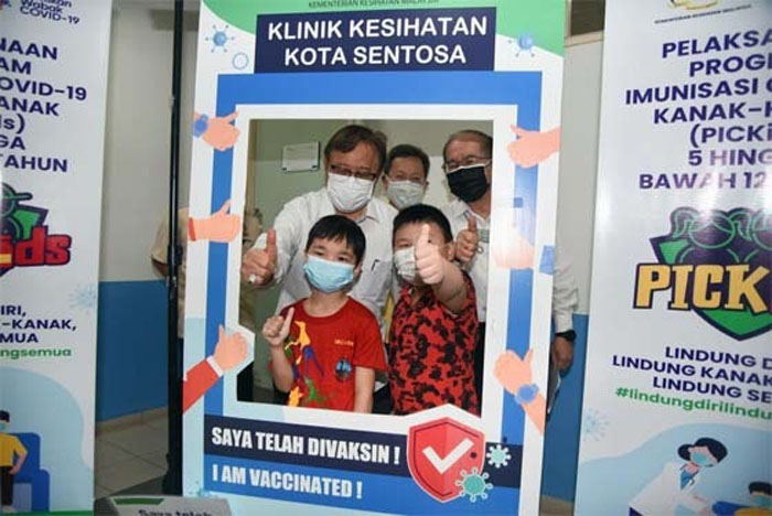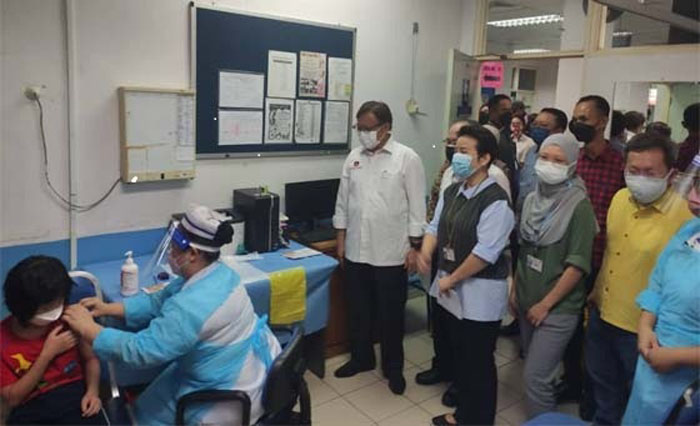●砂总理拿督巴丁宜丹斯里阿邦佐哈里,在副总理拿督斯里沈桂贤以及拿督阿玛道格拉斯的陪同下,到古晋7哩圣陶沙诊所,了解儿童注射冠病疫苗情况。
