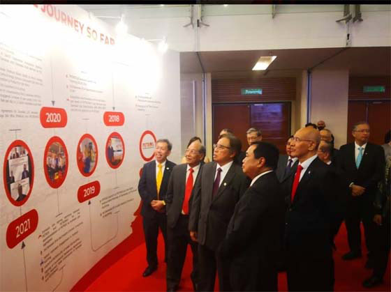 ●砂总理阿邦佐哈里(左三)在砂副总理拿督斯里沈桂贤、砂石油公司主席哈密布戈等的陪同下,观赏砂石油公司5年来的历程。