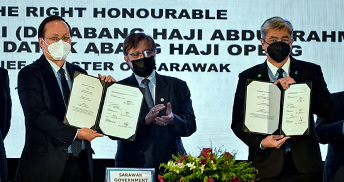 ●砂总理阿邦佐哈里(中)见证砂石油公司与国油公司签署协议,增加后者对砂拉越的天然汽供应。