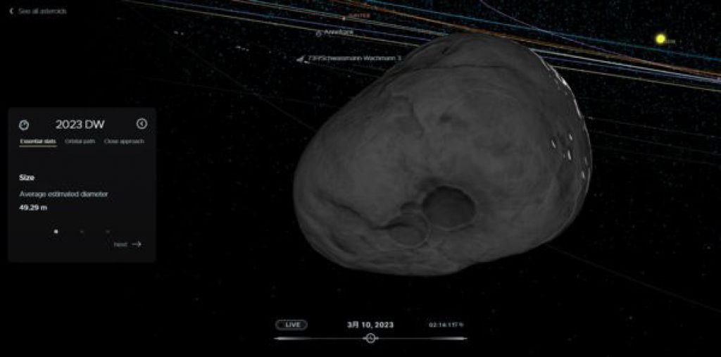 CNN报导,NASA所属行星防御协调办公室7日指出,小行星2023 DW直径近50公尺,相当于一个奥运泳池或足球场的大小,以每秒25公里的速度环绕太阳,目前距离地球约1800万公里。