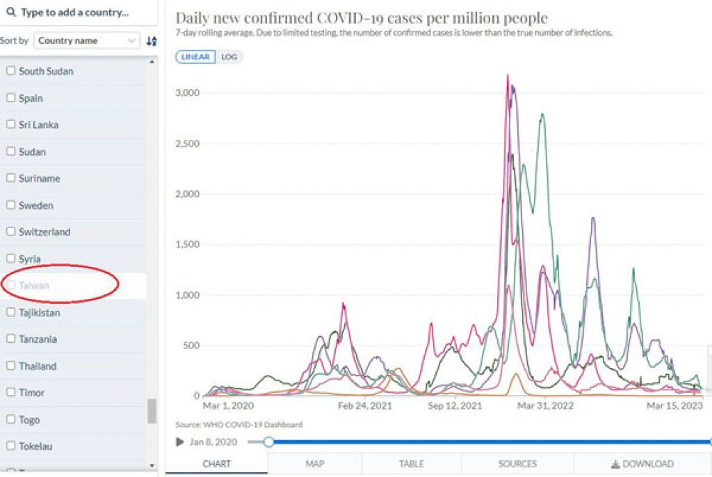 WHO一名发言人表示,台湾的数据自OWID消失,因为“我们的中国数据涵盖整个大中华地区(greater China),包括台湾,且不分别列举”。
