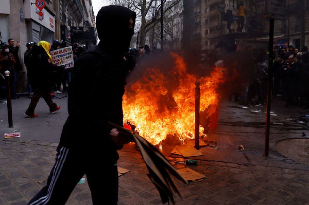 在巴黎东区,部分身著黑衣、蒙脸的抗议者袭击一家杂货店、并在游行接近民族广场时纵火,警方使用催泪瓦斯并冲向示威者。