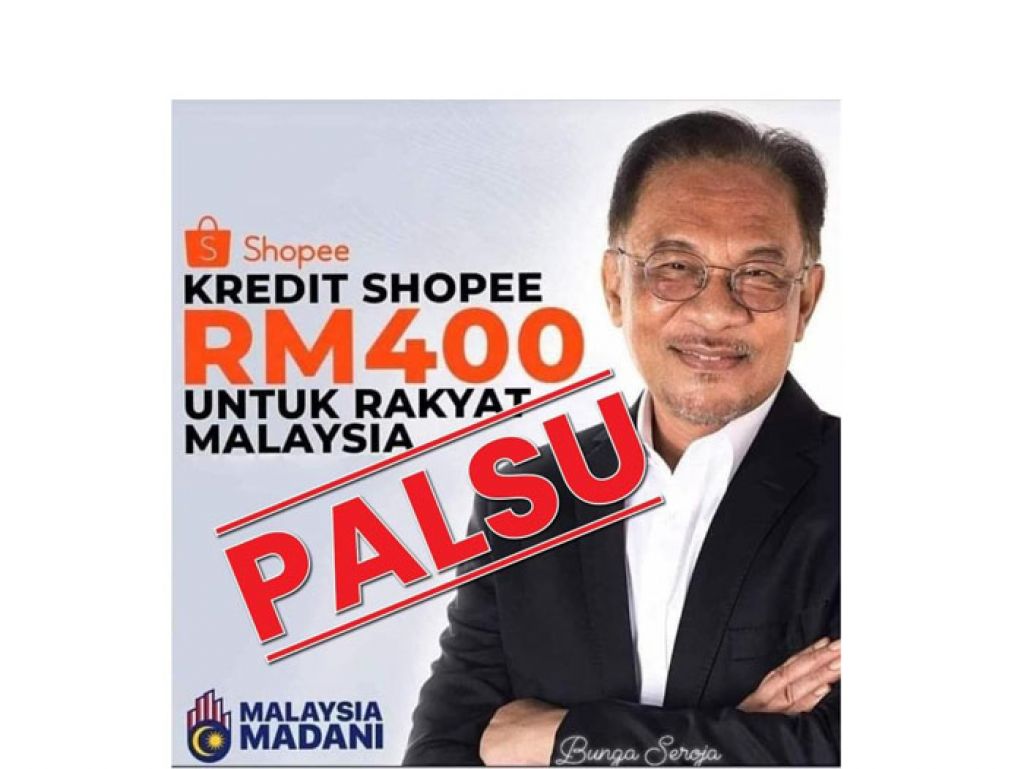 政府派发400令吉礼券? 首相署:假的! 06 04, 2023 登载于 大马 (吉隆坡6日讯)首相署澄清,最近网上流传一则“提供国人400令吉Shopee礼券”海报是假消息。 该海报印有首相拿督斯里安华的肖像,以及“昌明大马”(Malaysia Madani) 的标志在社交媒体上疯传。 首相署周三在脸书专页发帖说:“这是一则假新闻,同时吁请公众不要分享未经核实的或假新闻。 Last modified onThursday, 06 April 2023 10:51 更多相关: « 一马公司追讨近66亿美元案 高庭定724聆审2答辩人撤控申请 《公正党创立24周年》安华告诫:权力是信任非特权 »
