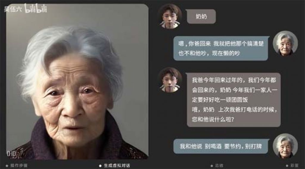 上海一位24岁的00后视觉设计师——B站博主@吴伍六,他用AI工具生成了奶奶的虚拟数字人,并和她用视频对话视频里“奶奶”讲着湖北的方言,头发花白,没有牙齿,像她生前一样“唠叨”。