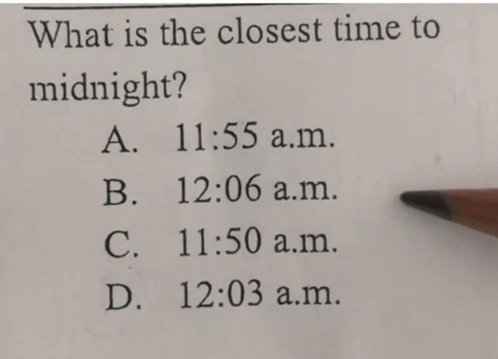 推特帐号@yawdmontweet发文询问,图中的英文考题为“哪个时间最接近午夜(What is the closest time to midnight)”,4个选项分别为A(11:55 a.m.);B(12:06 a.m.);C(11:50 a.m.);D(12:03 a.m.)。