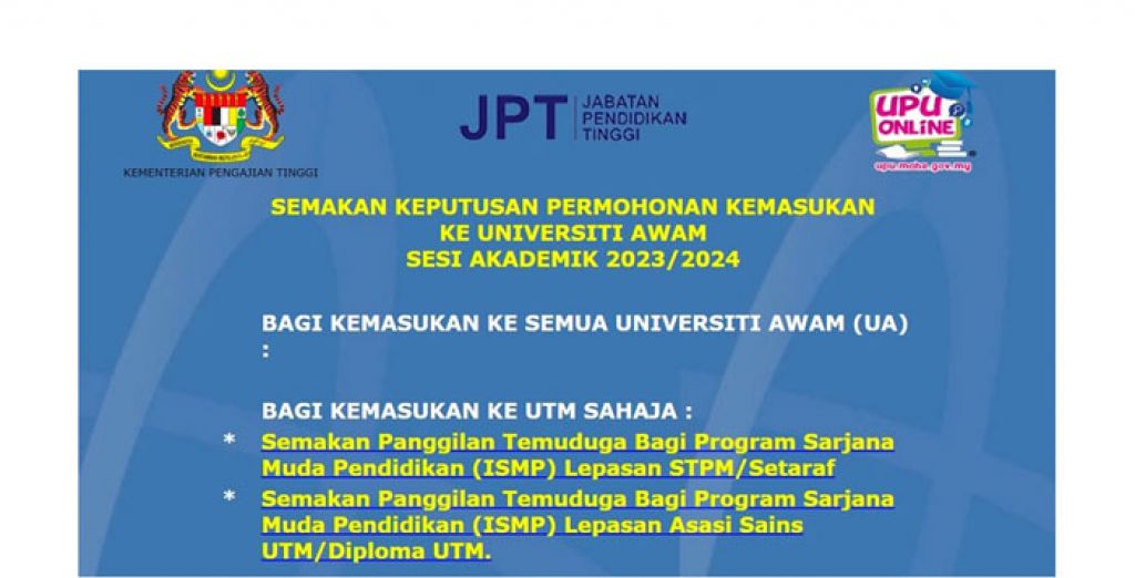 查询申请结果网站为https://jpt.utm.my 、https://jpt.uum.edu.my、https://jpt.unimas.my 、https://jpt.ums.edu.my及http://jpt.umt.edu.my,或UPUPocket手机应用程序。