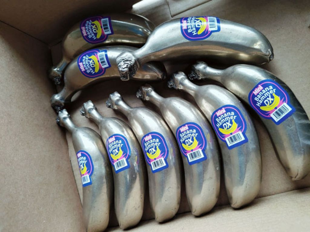 在得知顾客们希望有一款由整根香蕉制成的铁锤的要求后,IRON FACTORY IKEDA也推出了这款钢铁香蕉,还标榜每根香蕉的轮廓和大小都各异,并能在摄氏1千度的环境下使用,主要用途就跟铁锤一样,令人哭笑不得。