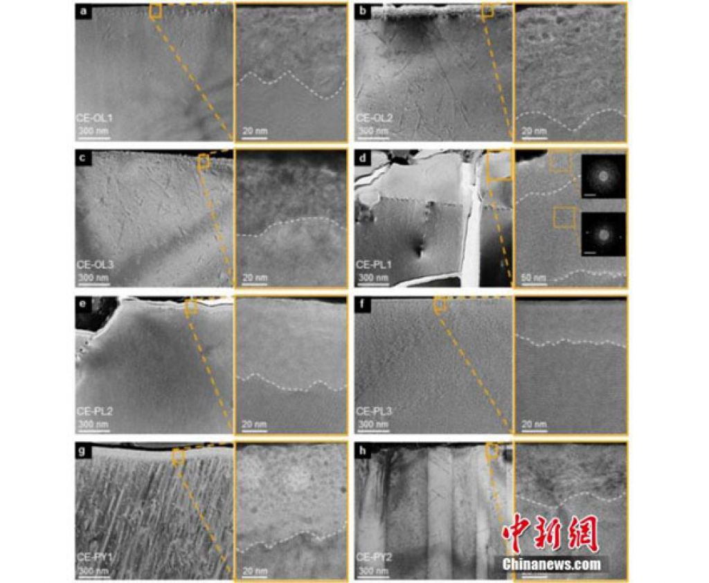 记者2022年9月12日从中国科学院地球化学研究所获悉,通过对嫦娥五号月壤样品研究,发现嫦娥五号矿物表层中存在高含量的水,来源于太阳风的注入作用,其主要以OH的形式存在。嫦娥五号矿物表层显微结构的TEM图。