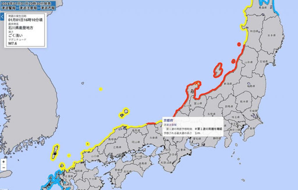 (综合2日电)日本气象厅持续发布警讯,就在1日下午4点10分左右石川县能登发生7.6强震后,京都府舞鹤市于晚间7时39分观测到30公分海啸,京都府已发布海啸警报,示警附近民众沿海地区很危险,应立即离开。由于海流强劲,在警报解除前,不要进入或靠近该区域海岸。